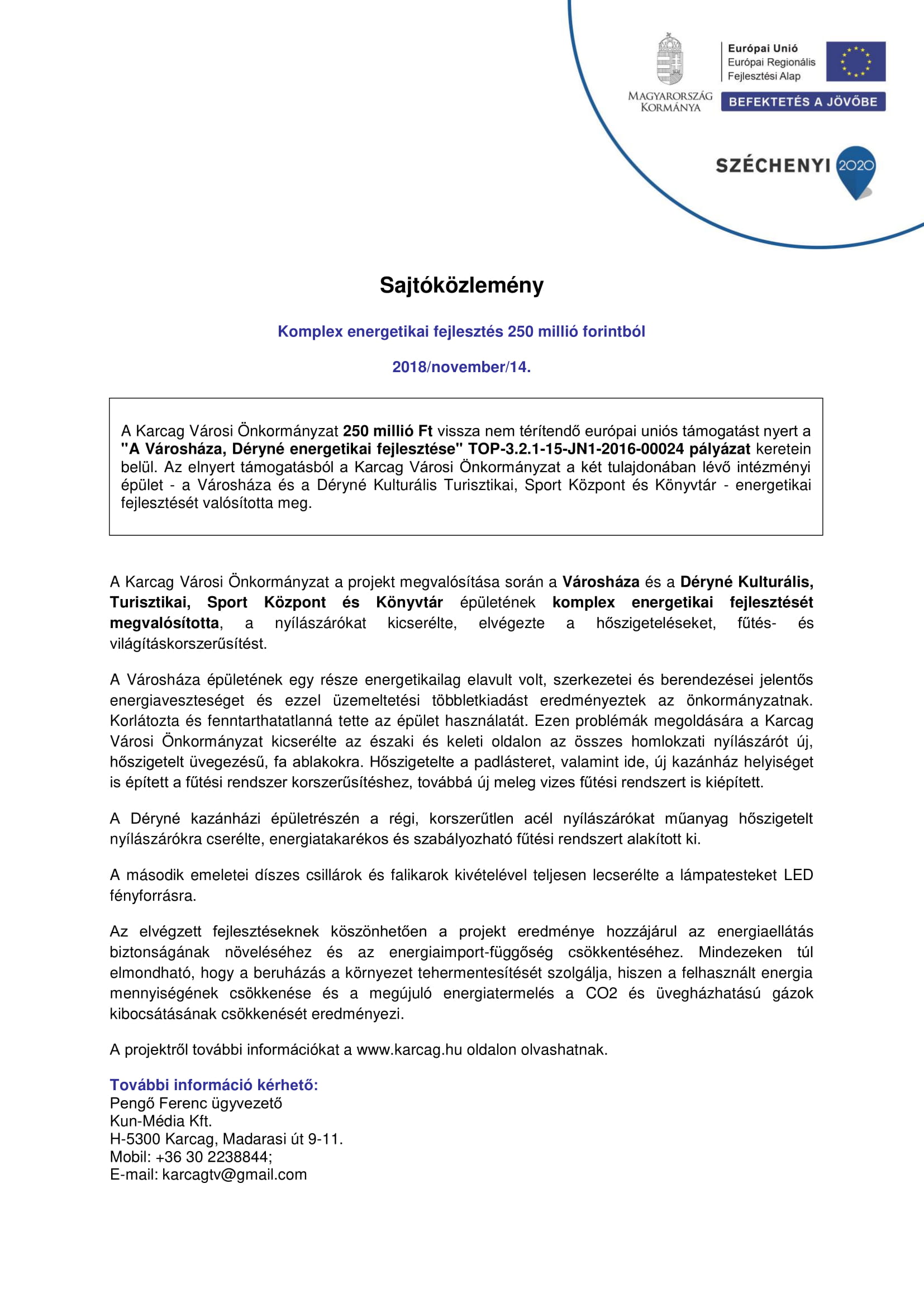 A Karcag Városi Önkormányzat a projekt megvalósítása során a Városháza és a Déryné Kulturális, Turisztikai, Sport Központ és Könyvtár épületének komplex energetikai fejlesztését megvalósította, a nyílászárókat kicserélte, elvégezte a hőszigeteléseket, fűtés- és világításkorszerűsítést.