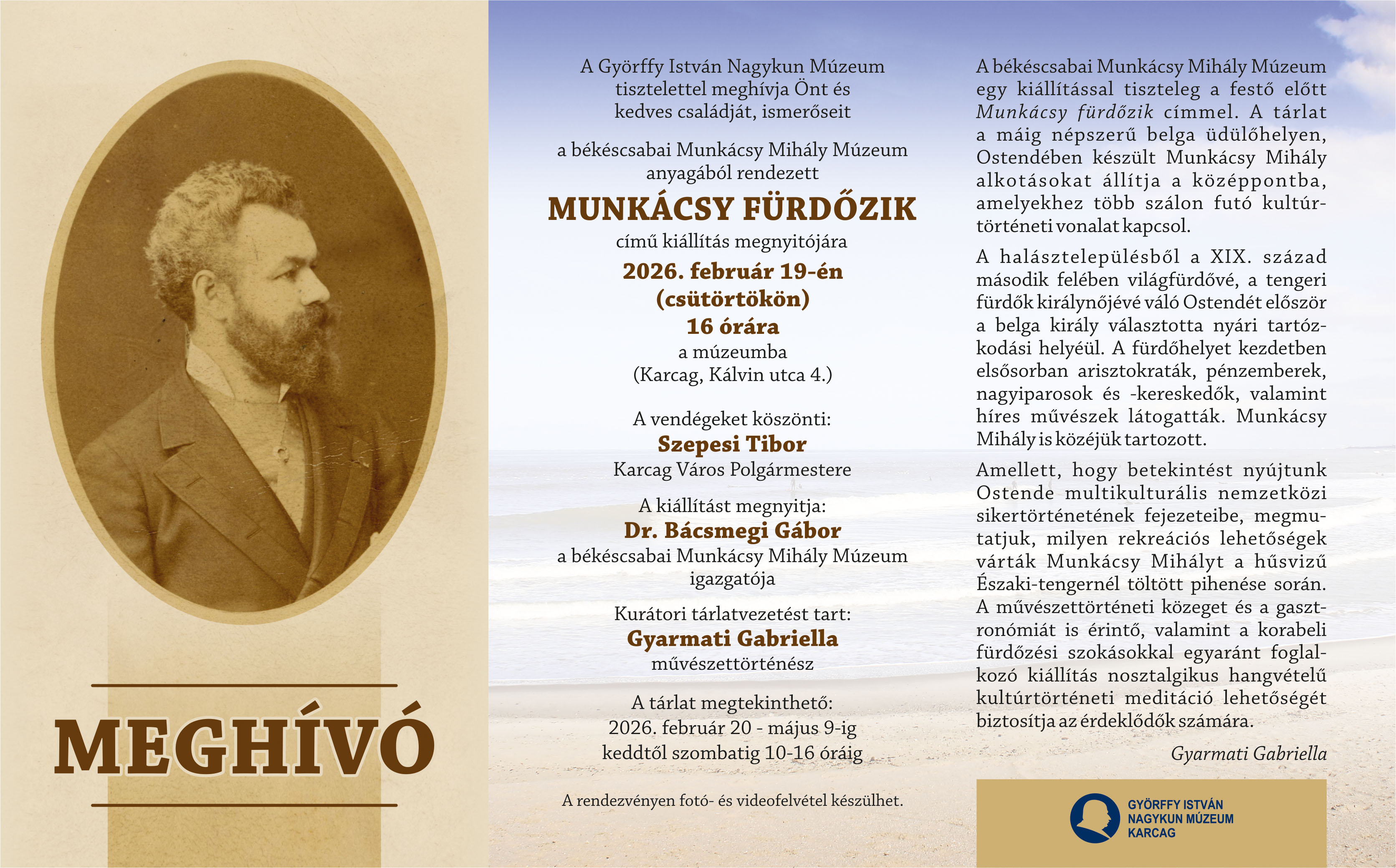 MUNKÁCSY FÜRDŐZIKncímű kiállítás megnyitójára 2026. február 19-én (csütörtökön) 16 órára a múzeumba (Karcag, Kálvin utca 4.)