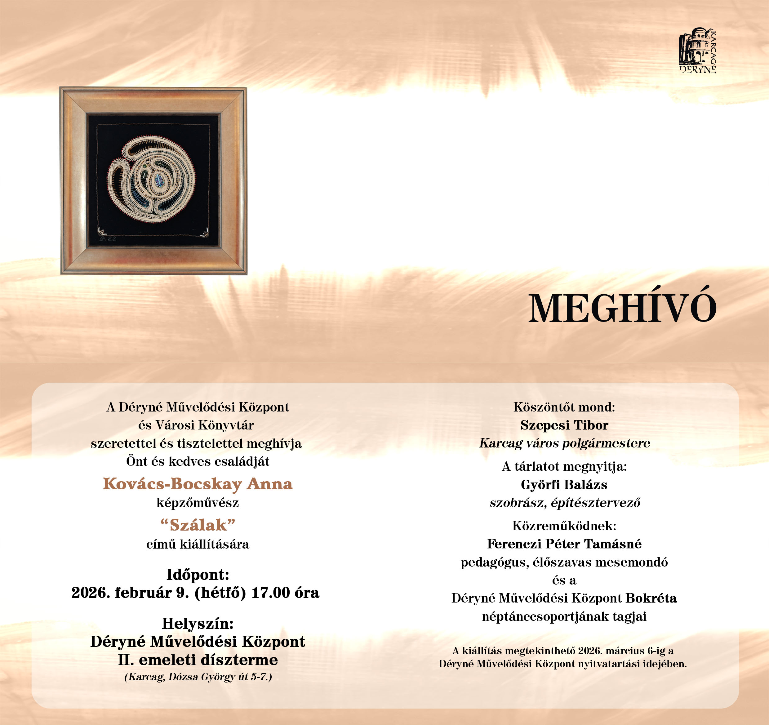 A Déryné Művelődési Központ és Városi Könyvtár tisztelettel meghívja Önt és kedves családját az ünnepélyes kiállításmegnyitóra.
