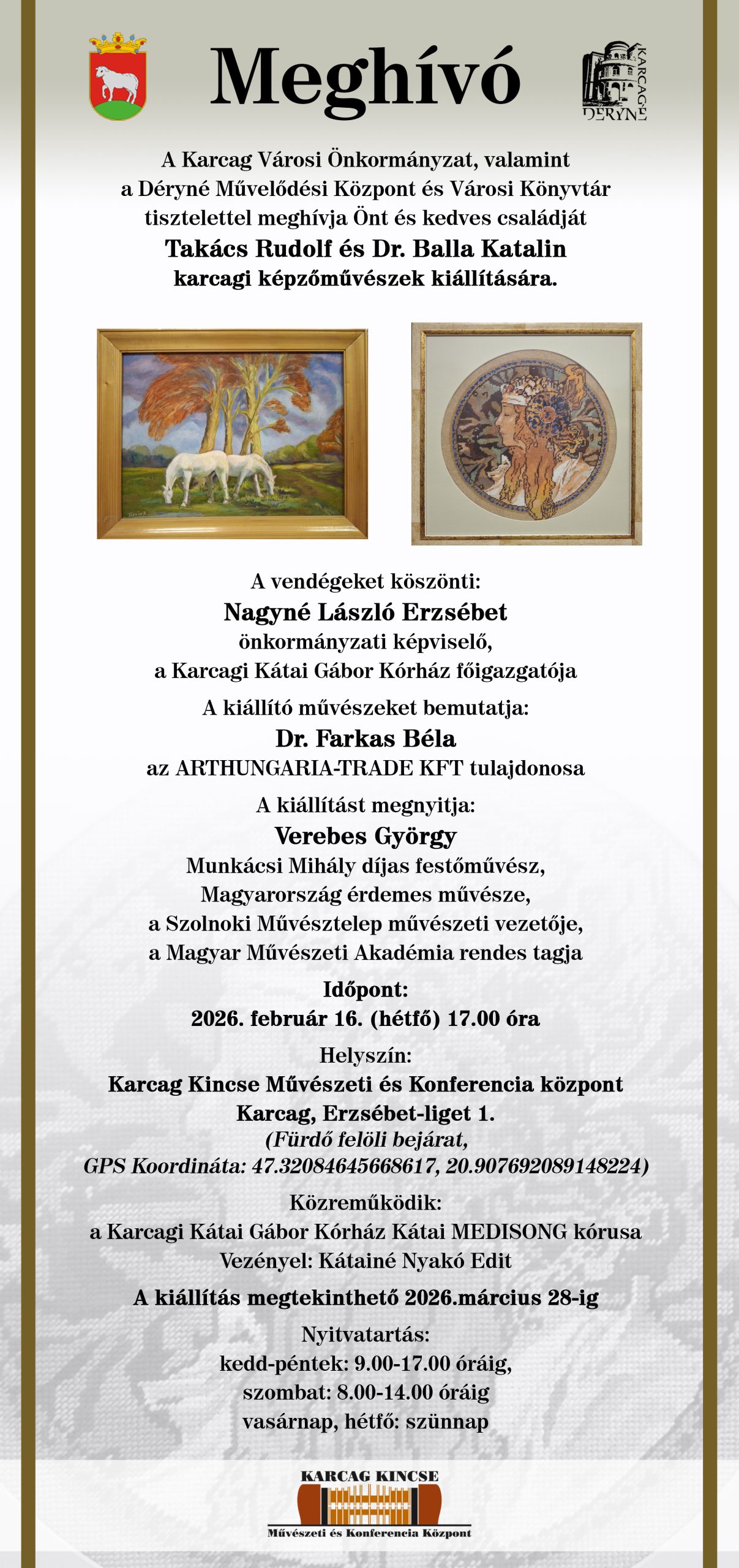 A Karcag Városi Önkormányzat, valamint a Déryné Művelődési Központ és Városi Könyvtár tisztelettel meghívja Önt és kedves családját Takács Rudolf és Dr. Balla Katalin karcagi képzőművészek kiállítására.