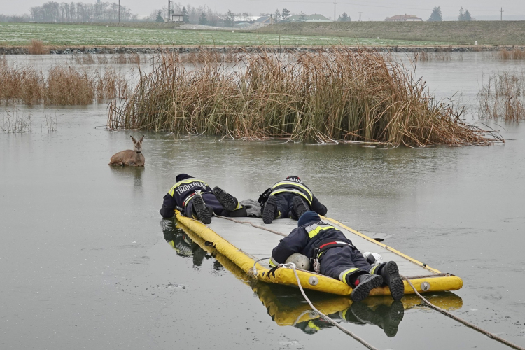 A helyi vadásztársaság jelzésére a tó jegéről mentettek őzet a tűzoltók kedden Csepregen.