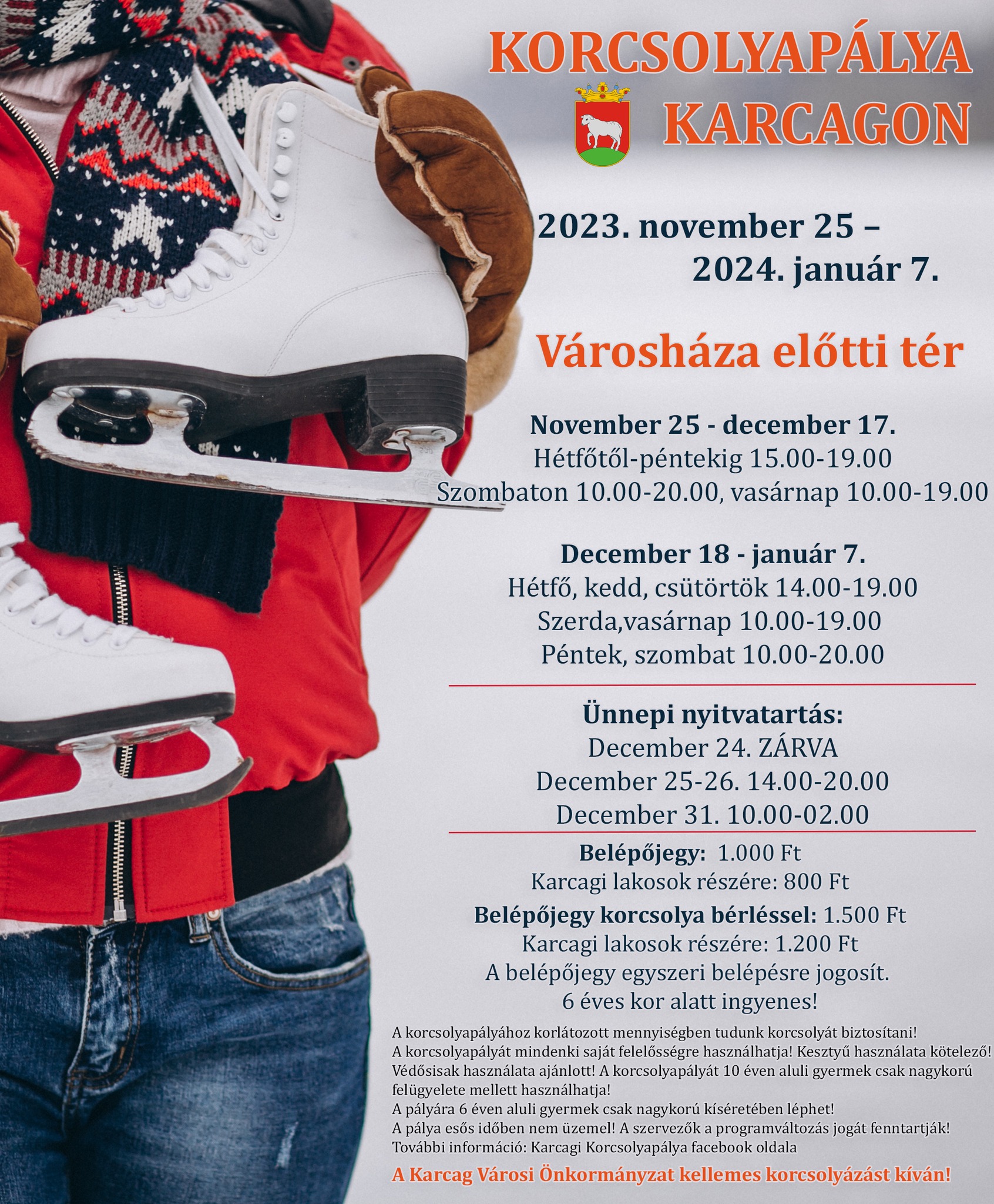 A korcsolyapályán a kesztyű használata kötelező, a védősisak használata pedig ajánlott.