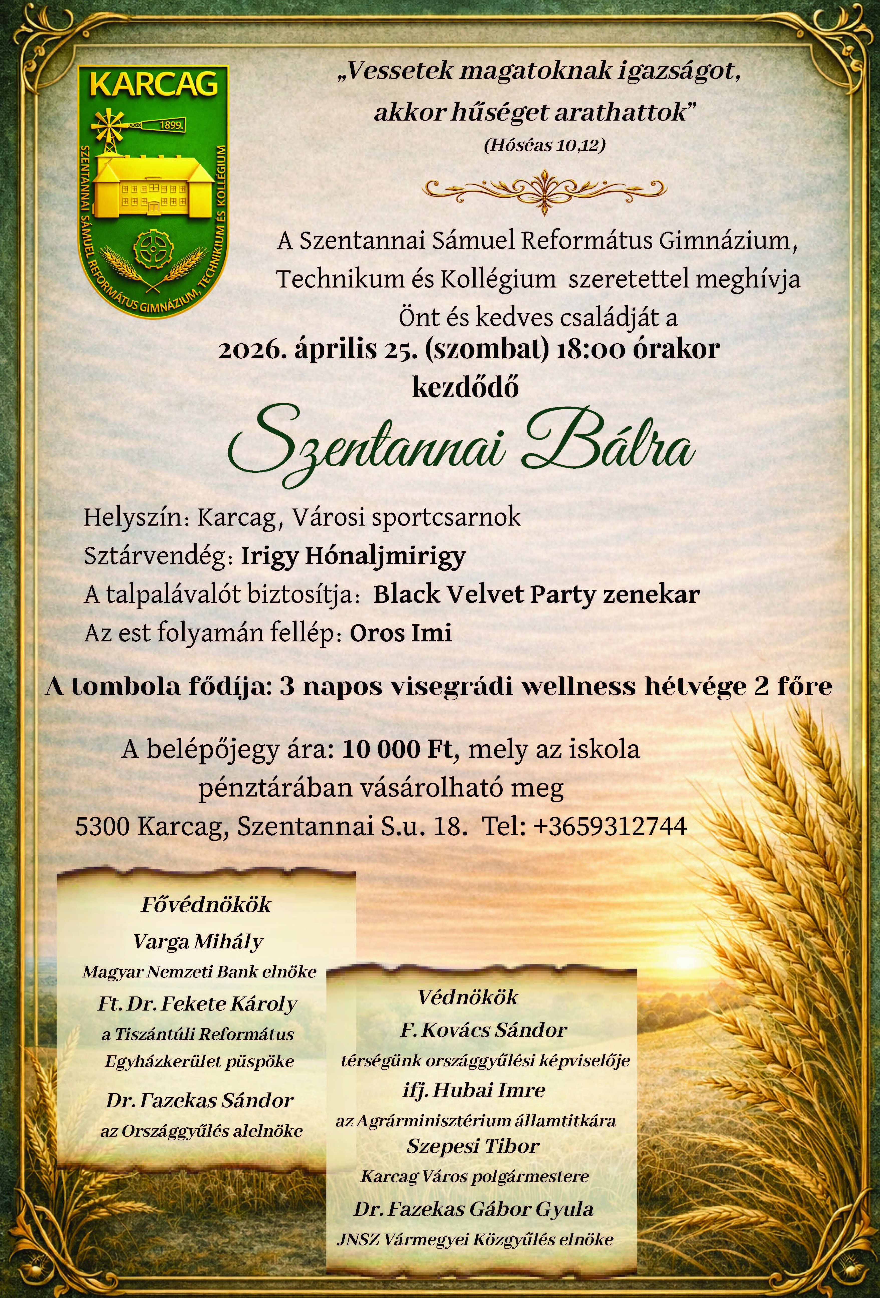 A Szentannai Sámuel Református Gimnázium, Technikum és Kollégium szeretettel meghívja Önt és kedves családját a 2026. április 25. (szombat) 18:00 órakor kezdődő